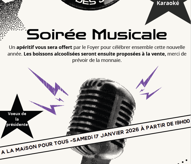Le Samedi 17 Janvier 2026 à partir de 19H00 à la Maison pour Tous. Ouvert à tous